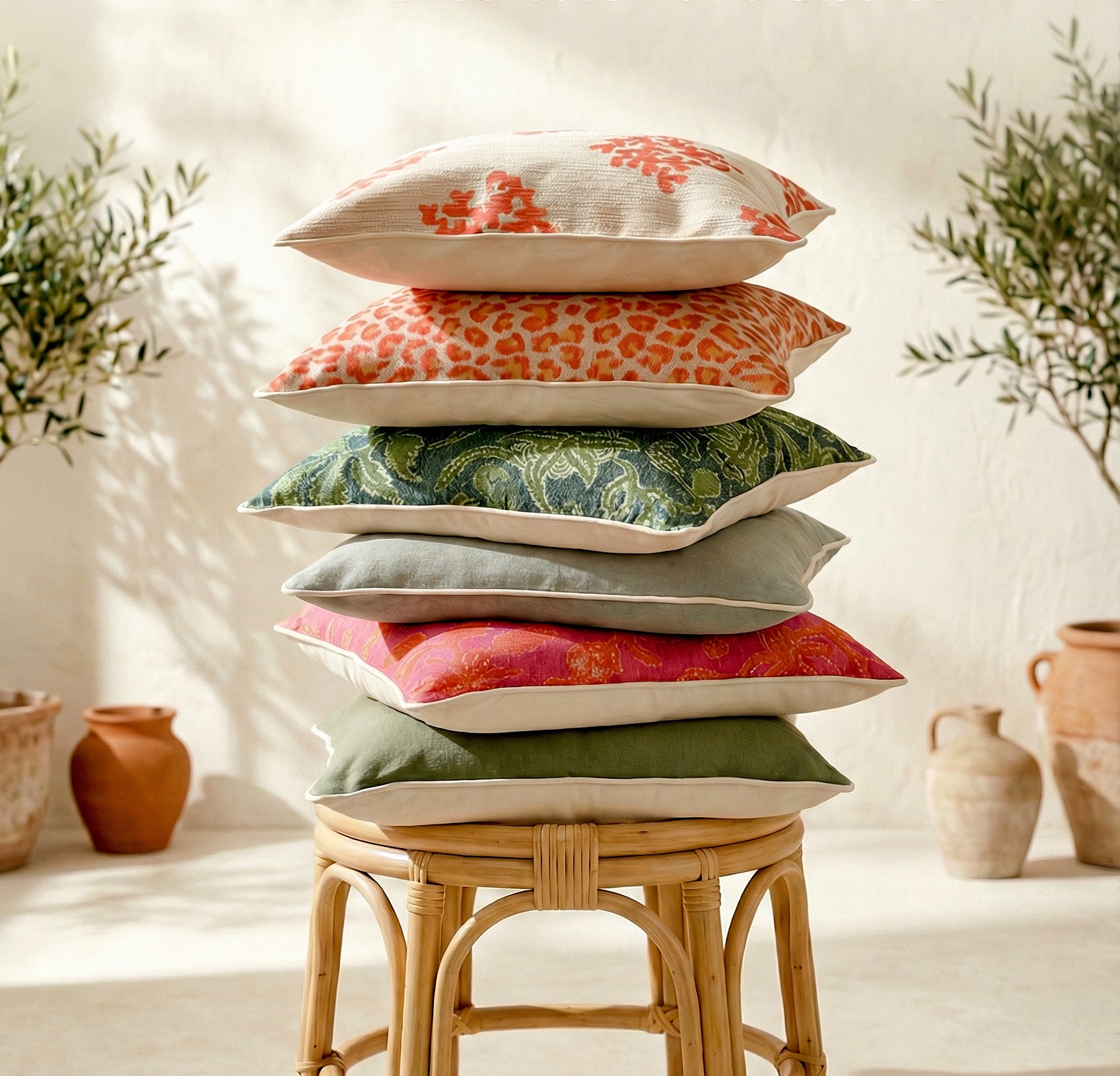 Our winter solids offer a grounded foundation of charcoal, stone, and earthy green, but the mythical bird print is the soul of the collection. It weaves these natural hues together perfectly, making it the ultimate statement piece for a neutral-focused room.